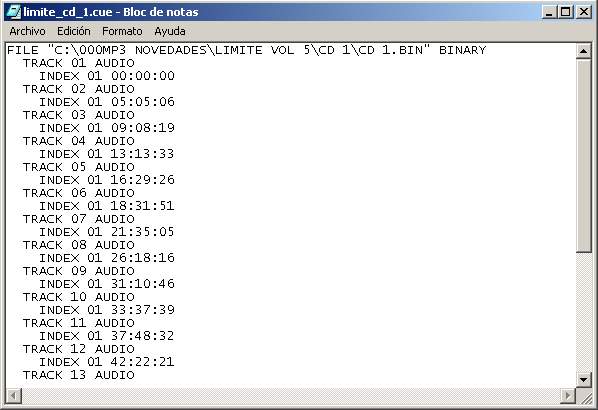 Donde pone en el dibujo: FILE "C:\000MP3 NOVEDADES\LIMITE VOL 5\CD 1\CD 1.BIN" BINARY debemos poner: FILE "La ruta donde se encuentra la sesion en tu disco duro, respeta las mayusculas y minusculas" WAVE