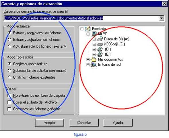 Con la opción "Extraer ficheros..." Nos sale el cuadro de diálogo de la figura 5. En el que podremos determinar: